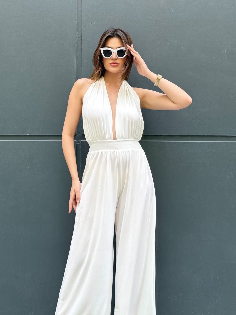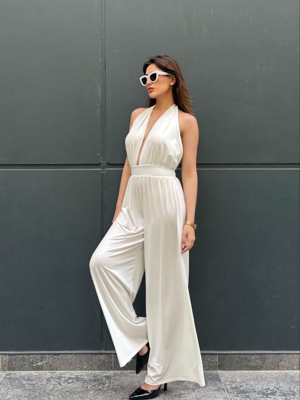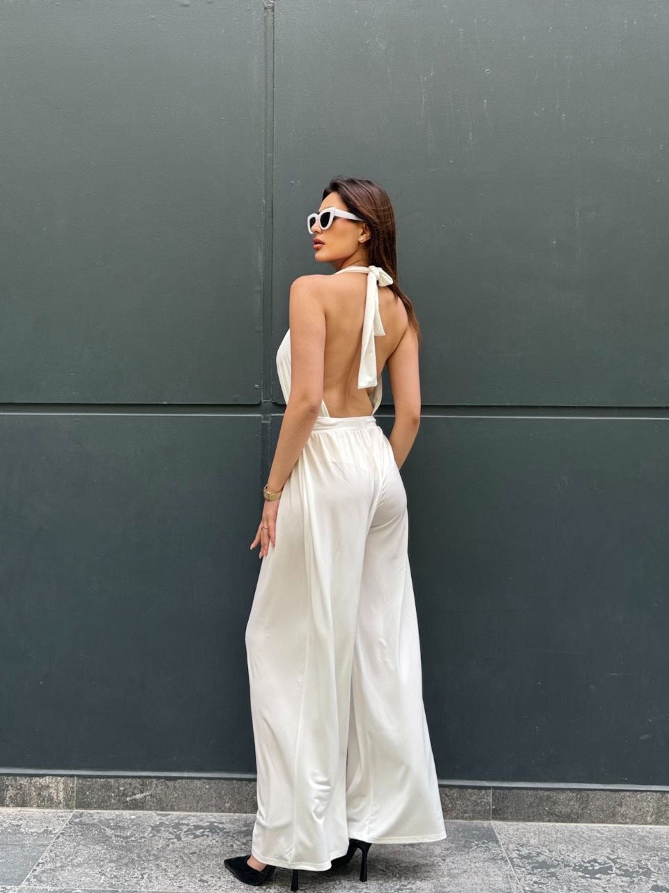 Beyaz Saten Görünümlü Halter Yaka Tulum