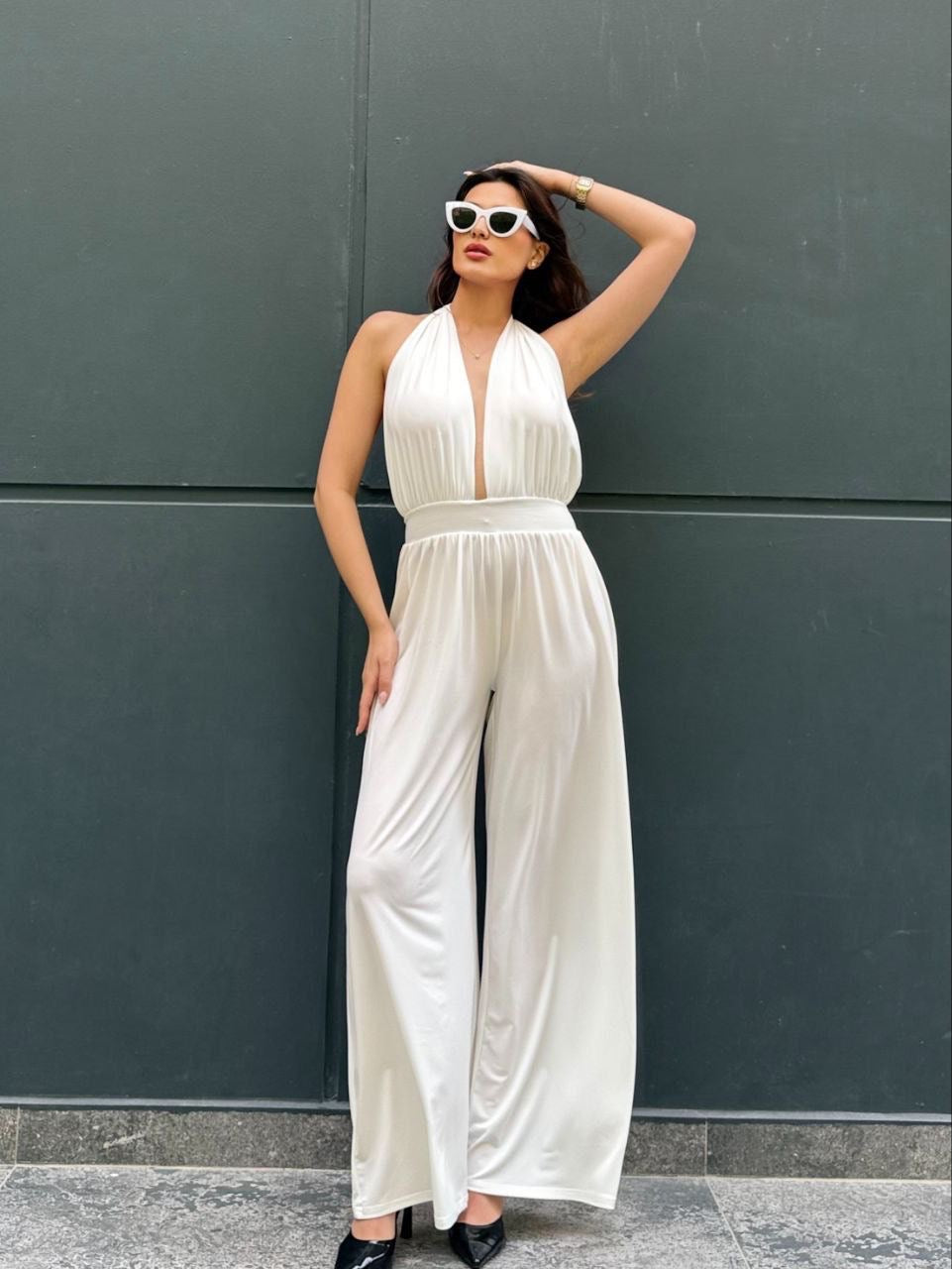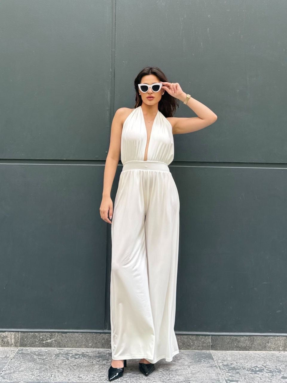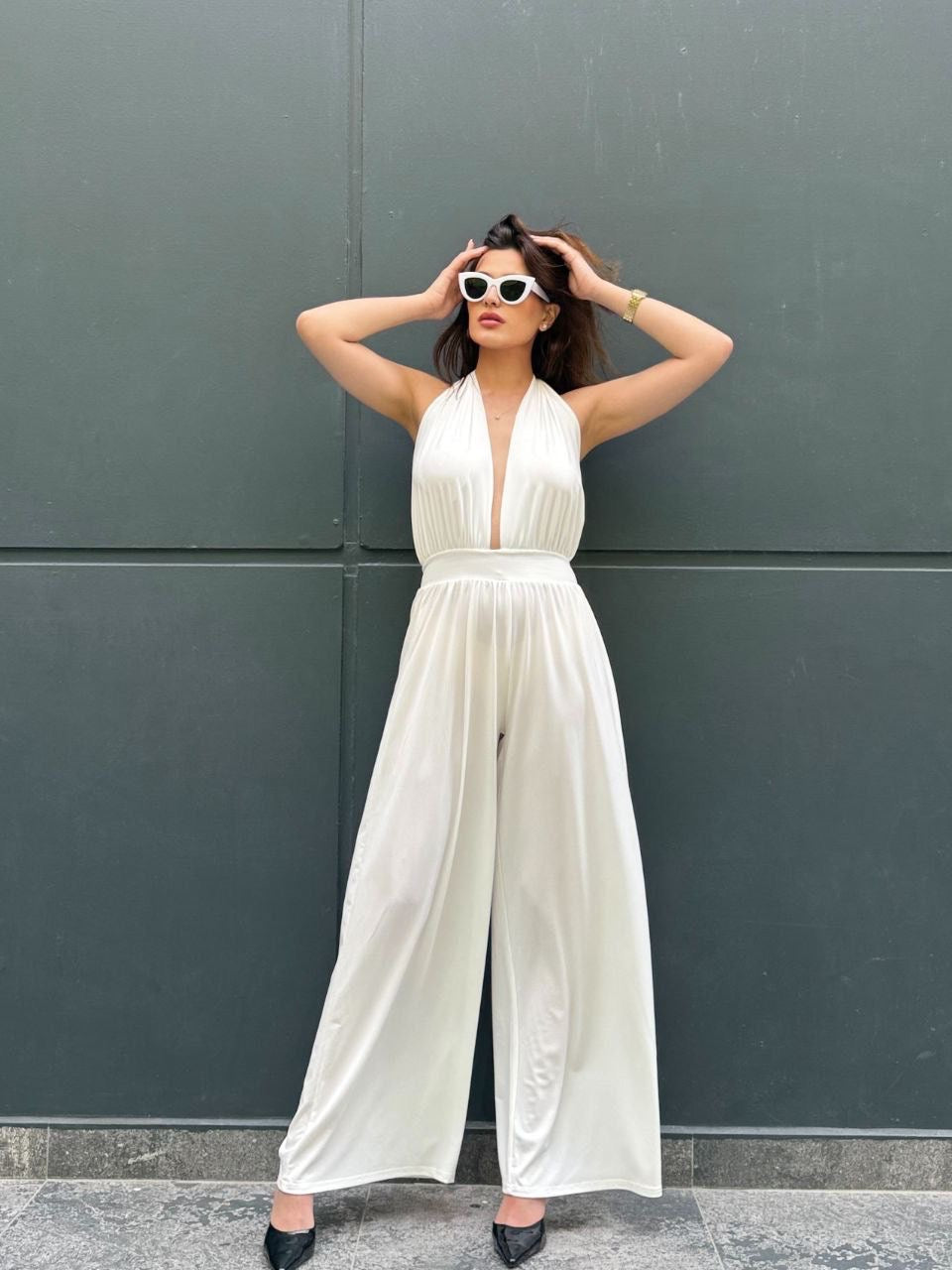 Beyaz Saten Görünümlü Halter Yaka Tulum