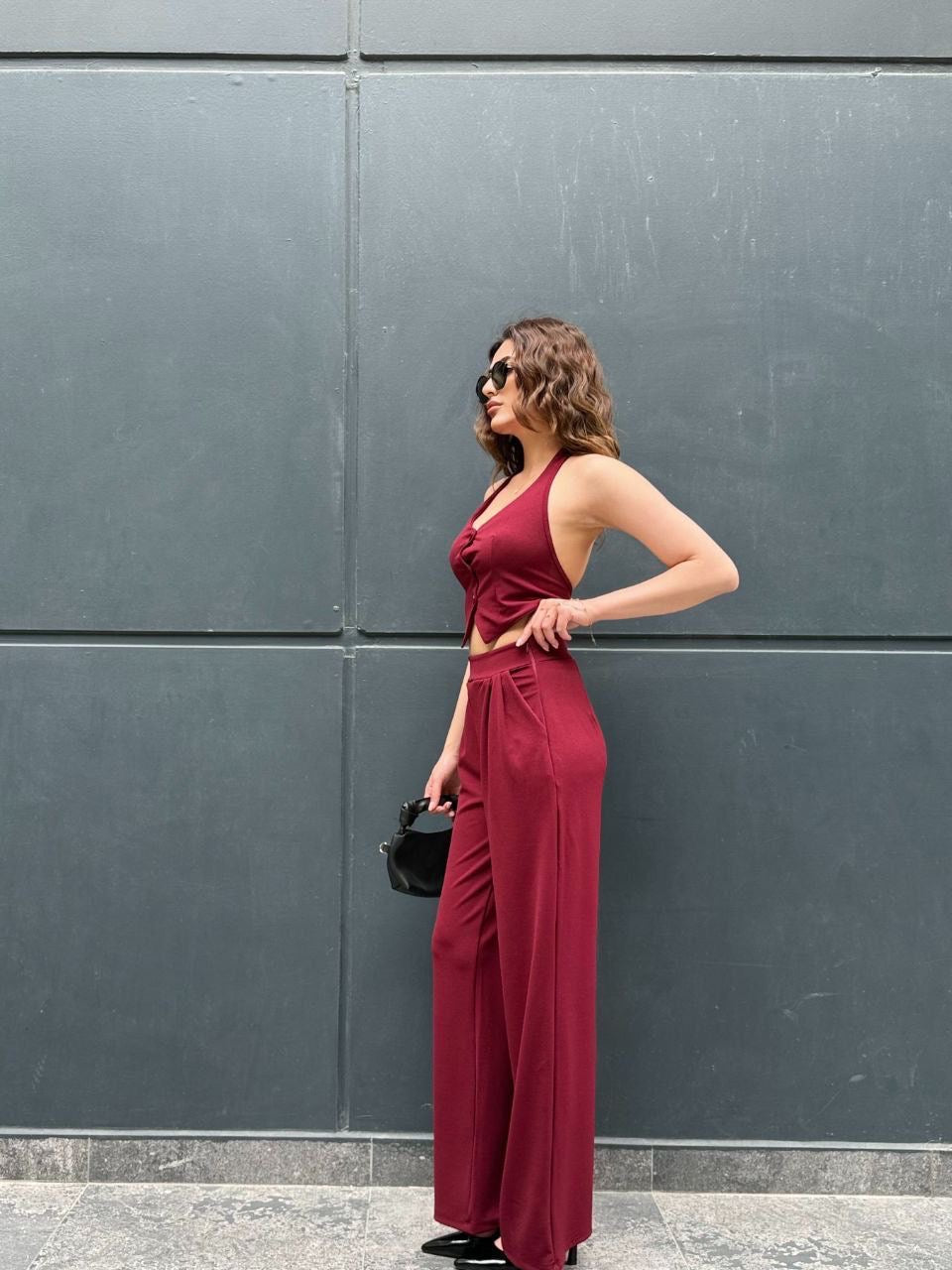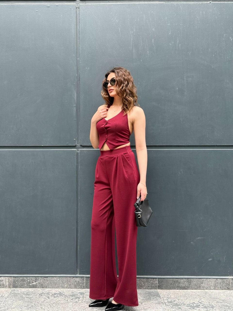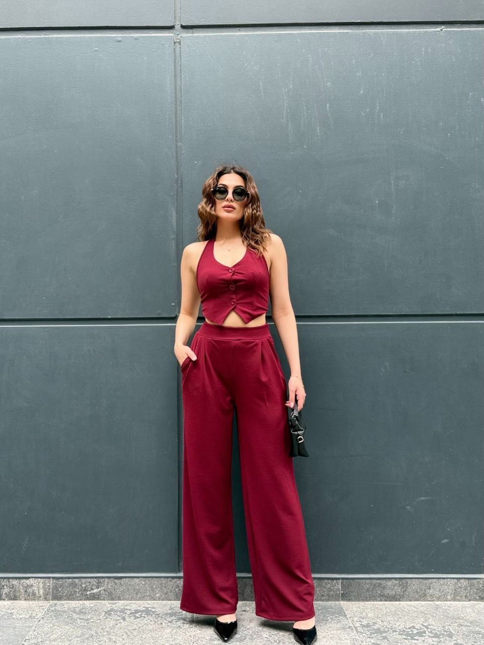 Günlük şıklığı ve modern çizgiyi bir araya getiren bu bordo ikili takım, gardırobunuzun favorisi olmaya aday. Halter yaka crop üst kısmı, öndeki düğme detayları ve bel kısmındaki minimal açıklıkla feminen bir hava katarken; yüksek bel bol paça pantolonu rahatlığı ve zarafeti bir arada sunar.