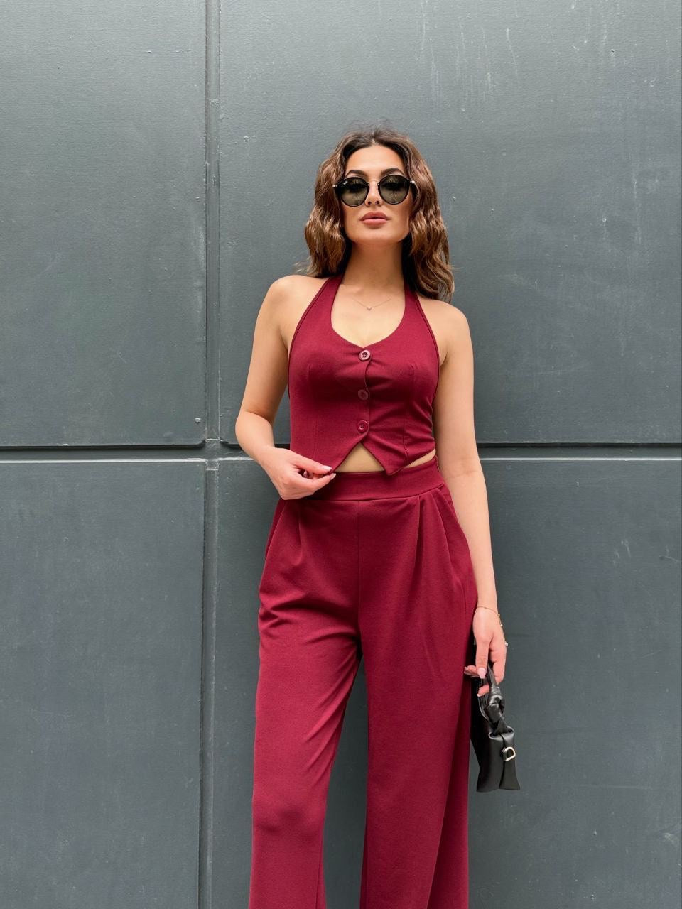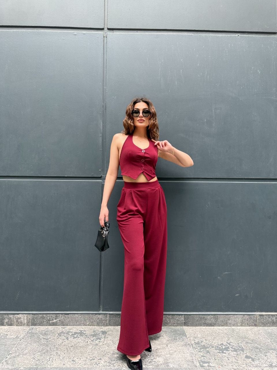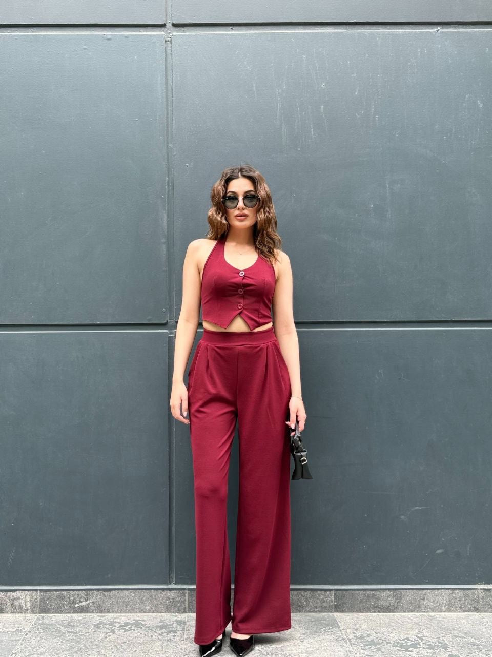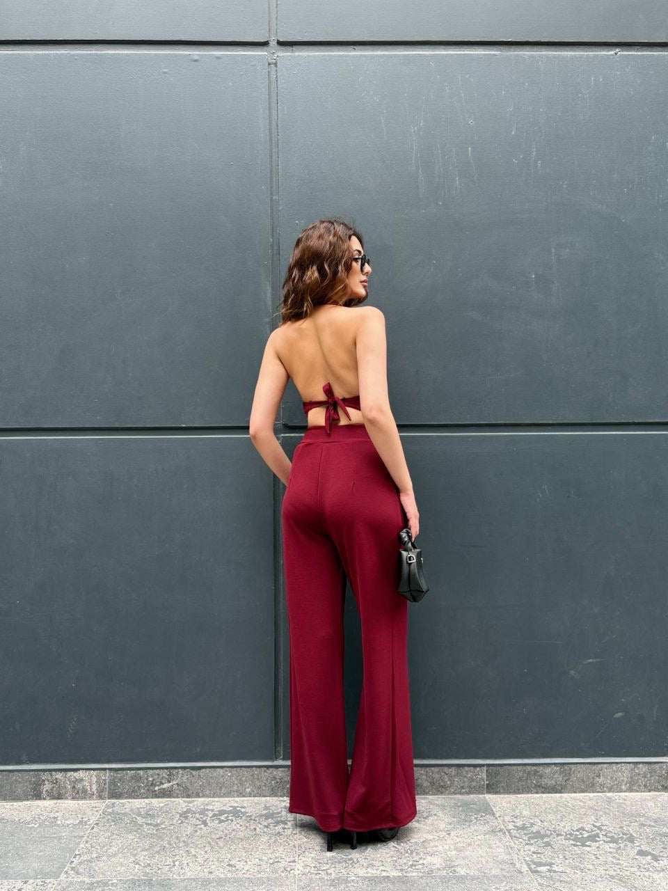 Günlük şıklığı ve modern çizgiyi bir araya getiren bu bordo ikili takım, gardırobunuzun favorisi olmaya aday. Halter yaka crop üst kısmı, öndeki düğme detayları ve bel kısmındaki minimal açıklıkla feminen bir hava katarken; yüksek bel bol paça pantolonu rahatlığı ve zarafeti bir arada sunar.