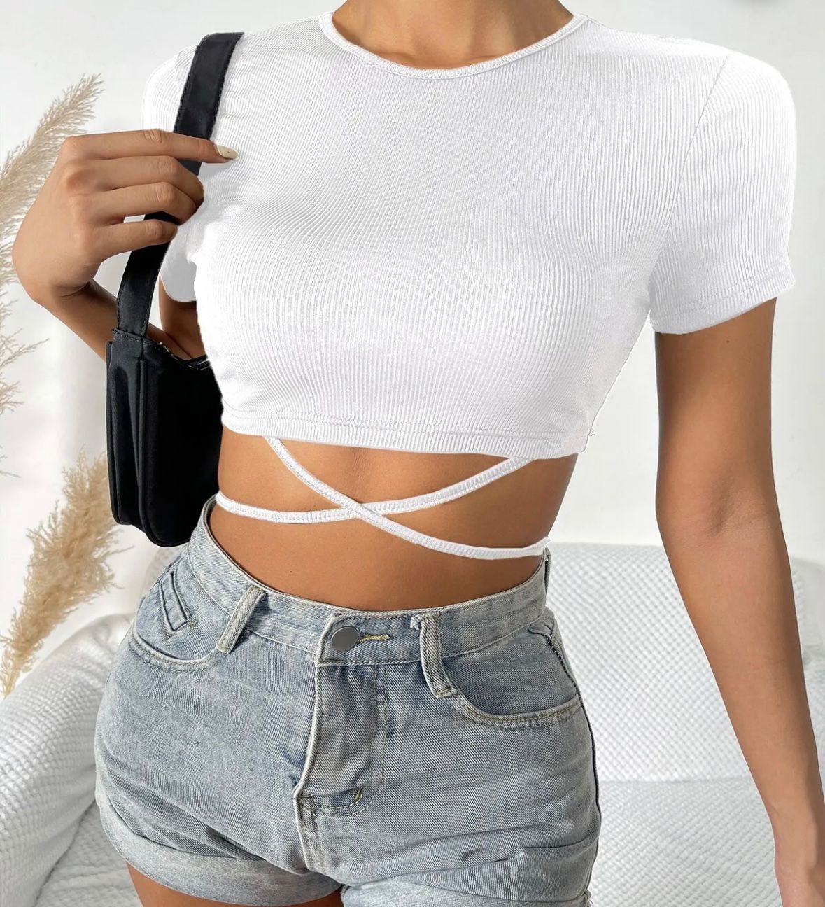 Çarpaz Bağlamalı Crop Esnek Kumaş Fitilli