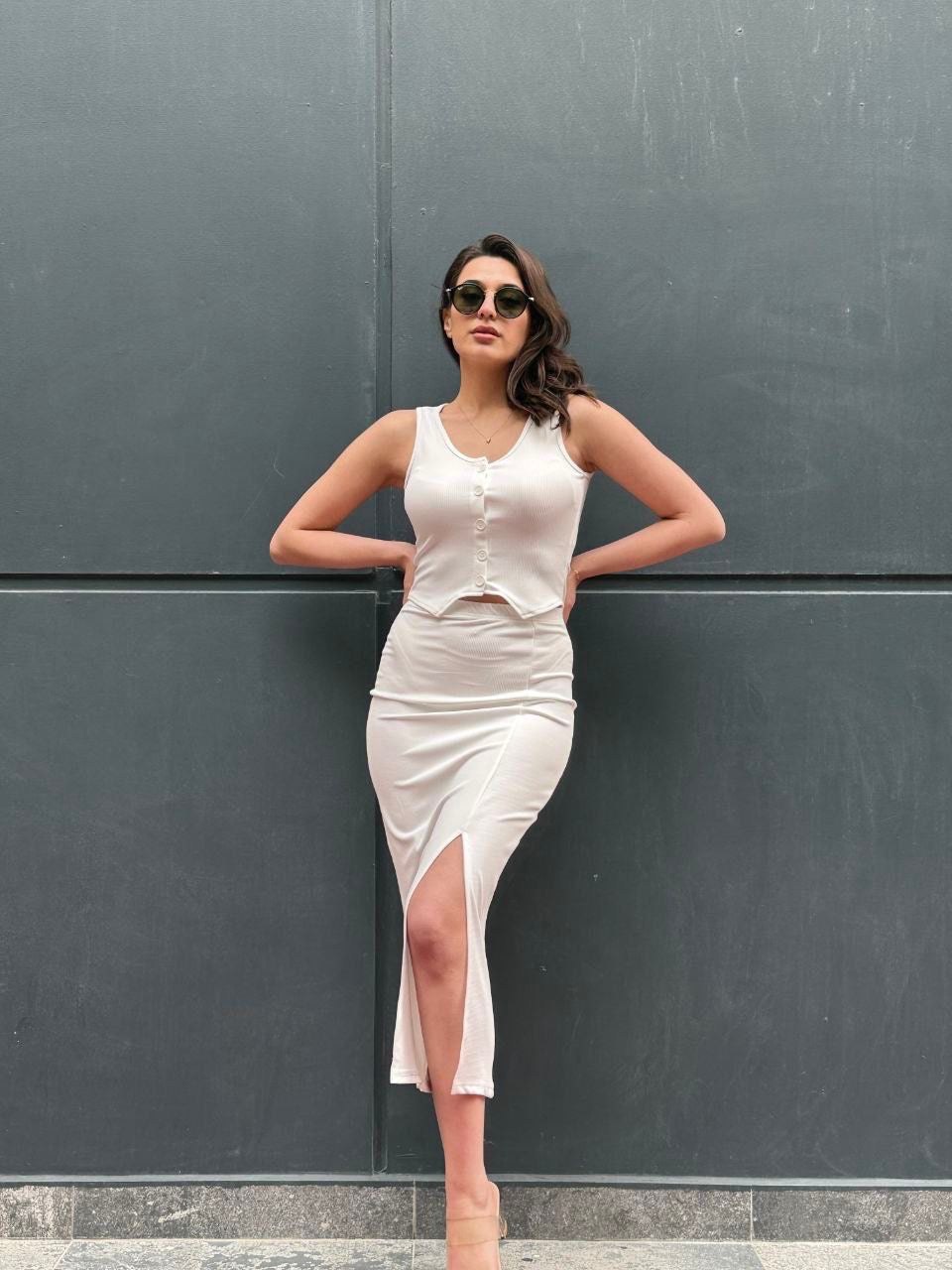 Düğmeli Crop Bluz ve Yırtmaçlı Kalem Etek Takım Beyaz
